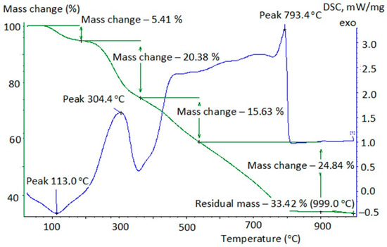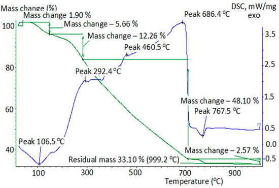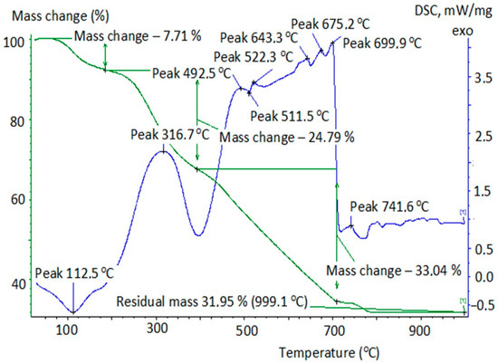 The calculation of the composites’ weight was carried out at their thermal degradation depending on the conditions of the removal of oxalic acid from the model solutions (Table 2). Table 2 shows that the absorption of oxalic acid in normal conditions and in conditions of (H2O2 + UVI) reduced the thermal stability of the peat composite. Its burnout ended at T = 700 °C, in contrast to the initial unmodified peat. Obviously, oxalic acid partially reacted with the components of the peat’s organic part, which was displayed by the displacement of maximum exoeffect into the high-temperature region (316 °C, Figure 2) compared to the initial peat (304 °C, Figure 1). The thermogram in Figure 3 is also of interest. The smooth combustion of the sample and the absence of endoeffect at T = 350 °C at the DSC can be explained, in our opinion, either by the partial destruction of the composite structure due to the oxidant’s effect (H2O2 + UVI), or by the formation of a number of intermediate compounds on the surface of the composite (surface-active complexes, possibly oxalate). The reason for their possible formation could be the interaction of H2C2O4 with the components of the peat’s organic part and the emergence of •OH radicals in the Ruff-Fenton system, which provides process flow at lower activation energies. However, no information was found in the literature to explain the obtained results.