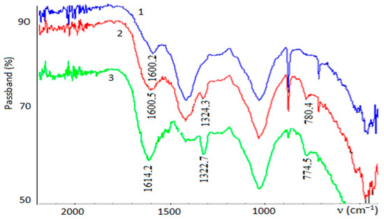 Figure 4 shows that the absorption band characterizing the complexation of iron (III) with an oxalate ion appears in the area of 1580–1620 cm−1 (curves 2 and 3). For the initial composite the absorption band is less intense, as in this case there is the complexation of iron ions (III) only with the carboxyl groups of humic substances of peat (curve 1). The shift of the absorption band into the area of shorter wavelengths indicates a strengthening of the M–O bond, as was also observed under sorption and under the condition of (UVR + H2O2). The absorption bands at 1320–1330 and 780 cm−1 in the spectra of the samples are related to the fluctuations of metal oxalates [29]. These bands are not in the initial sample.