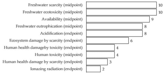 Impacts related to water are associated with numerous environmental mechanisms and therefore numerous category indicators and water footprint impact assessment methods can be used. A category indicator is the quantifiable representation of an impact category. Regarding the category indicators, the stakeholder group concluded that the choice of these indicators, also depends on the intended audience, for example, if the study has a scientific nature, it is recommended to choose the category midpoints to conserve the objectivity and scientific robustness of the impact categories assessed. The use of category endpoints, is recommended for screening studies, to evaluate the categories that have greater relevance for each particular product []. Category midpoints are considered links in the cause-effect environmental mechanism of an impact category; common examples are climate change, eutrophication or ecotoxicity. Endpoint indicators (damages to ecosystem quality, human health and resources) reflect the relative importance of emissions or extractions at the end of the cause-effect chain, e.g., changes in biodiversity [].
