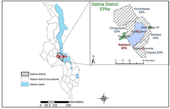 The study site, Katelera Extension Planning Area (EPA), is a sub-district administrative unit for agriculture extension in Salima district (Figure 1). Salima Rural Development Program has five EPAs—namely, Katelera, Chipoka, Tembwe, Chinguluwe and Khombedza. This district is located along the lakeshore agroecological zone. It has a total land area of 2196 square kilometers and a population of 337,895 [22]. The district is located in Malawi’s rift valley floor, which comprises of scattered hilly upland areas lying between 200 and 1000 m above sea level in elevation. Soils vary from clay-loam, alluvial deposits and deep dark clay and black to red shallow stony soils. The district experiences a generally warm tropical climate with mean annual temperatures of 22 degrees Celsius. Salima district experiences unimodal rainfall. Data for the past 30 years show mean precipitation of 1188.11 mm. Agriculture in the district, as in most of Malawi, is virtually all rainfall dependent. The main source of livelihood for the district is smallholder agriculture covering about 107,400 hectares of customary farmland.