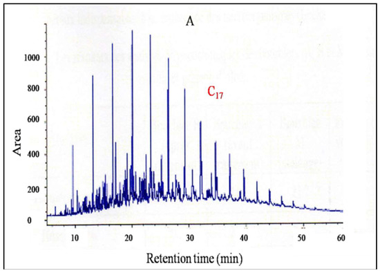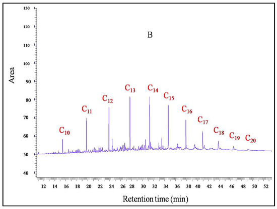 The analysis of the organic fraction obtained after distillation of the crude oil polluted soil proved that oil contains fuel fractions (Figure 1A,B) with presence of hydrocarbons ranging from C10 to C20. These results are in large agreement with those found earlier by Marchal et al. [41]. Besides, hydrocarbons with carbon number varying from 12 to 25 were previously reported [42].