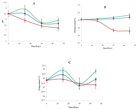 Evolution of pH (A), moisture (B), and temperature (C) during 45 days of treatment. Treatment with carrot peel waste (♦); Treatment with carob kibbles (■); and Control without treatment (▲). Error bars represent the standard error of replicates.