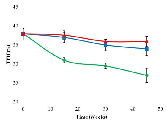 The rate of total petroleum hydrocarbon (TPH) during 45 days of treatment. Treatment with carrot peel waste (♦); Treatment with carob (■); and Control without treatment (▲). Error bars represent the standard error of replicates.