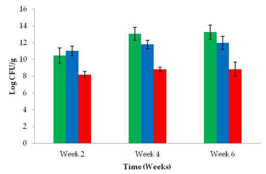 Evolution of microbial count during 6 weeks (45 days) of treatment. Treatment with carrot peel waste (■); Treatment with carob (■); and Control without treatment (■). Error bars represent the standard error of replicates. CFU: Colony Forming Unit.