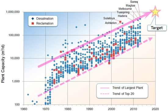 Seawater desalination plants applying the distillation process began operation in the mid-1960s. Since 2000, application of the energy saving RO (Reverse Osmosis) membrane process has surpassed the distillation process except in the Middle East, where major large seawater desalination plants still use the distillation process [1]. As shown in Figure 1 which was prepared in 2009, the scale of desalination plants have been increasing. Thus, we predicted that ultra-large plants of the mega-ton per day scale (1,000,000 m3/day) would be required by 2020. The construction of many ultra-large plants over the 500,000 m3/day started in 2017–2018 in the Middle East and North Africa (MENA country). MENA countries have recently decided to use the RO membrane process instead of the distillation process, such as multi-stage flash (MSF) and multi-effect distillation (MED) due to the lower energy consumption of plants. Therefore, mega-ton (10,000,000 m3/day) size plants adopting the SWRO (Seawater Reverse Osmosis) method are expected to be developed soon (Figure 1).