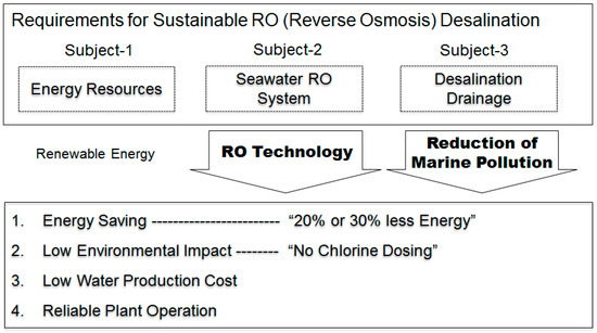 Seawater desalination in the 21st century requires: (1) Energy resources, (2) Seawater RO system, and (3) Desalination drainage to reduce marine pollution. Japan’s national research project, the “Mega-ton Water System,” was conducted with the aim of developing sustainable water treatment core technologies necessary for the 21st century. The missions of the project were: (1) energy saving (20% or 30%), (2) low environmental impact (no chlorine dosing), (3) low water production cost, and (4) reliable plant operation, as illustrated in Figure 2 [2].