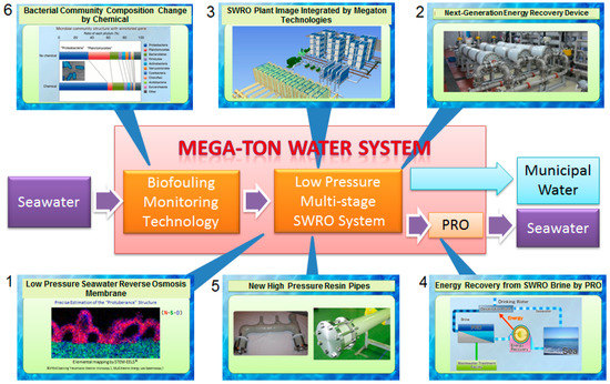 The output of the “Mega-ton Water System” were six indispensable technologies for the 21st century, and these are summarized in Figure 3. In order from left to right, in the top row, (6) Bacterial Community Composition Change by Chemical is related to the biofouling monitoring technology, (3) SWRO plant image integrated by Megaton Technologies, and (2) next-generation energy recovery device. Similarly, in the bottom row, (1) low-pressure SWRO membrane, (5) new high-pressure resin pipes, and (4) energy recovery from SWRO brine by pressure-retarded osmosis (PRO).