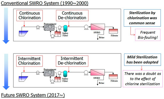 Sterilization of marine bacteria was considered effective for preventing biofouling of RO membranes, so continuous chlorination was applied (Figure 4). However, intermittent chlorination has now been found to be a more efficient method of SWRO biofouling control than continuous chlorination. The addition of chlorine is reported to be a trigger of biofouling [8,9,10,11]. The number of bacteria rapidly increases immediately after de-chlorination by SBS (sodium bisulfite) dosing. It is considered that chlorine added in raw water oxidizes natural organic matter (NOM) and microorganisms, and produces compounds that are easily assimilated by microorganisms. In addition, microorganisms exposed to chlorine might produce extracellular polymeric substances (EPS) accidentally or genetically as a defense mechanism and promote biofouling. The consumption of SBS has been found to increase with the SWRO plant operation time. There was a SWRO plant controlled the amount of SBS dosing in accordance with the RO brine levels. On one occasion, the decrease in concentration of SBS in the RO brine was observed, and so the level of SBS dosing amount upstream of the RO was increased. However, as time elapsed, the SBS concentration in the RO brine decreased again. This situation continued, and finally, a large amount of SBS was added to the system, and at the same time, RO differential pressure increased drastically. The result of the RO element autopsy showed the membrane surface covered with yellow foulant and Thiobacillus, which is a type of sulfur-oxidizing bacterium that can utilize reduced sulfur compounds, such as SBS, as an energy source, which indicates that the SBS alone can also be a trigger of biofouling [11]. However, there are no data that show direct evidence and quantitative impact of chlorination/de-chlorination on SWRO biofouling. To minimize biofouling, pretreatment processes will need to be established. The quantitative influence and mechanisms of chemical additives on the biofouling need clarifying.