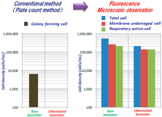 The influence of chlorination on marine bacteria was evaluated by batch testing of seawater samples collected from Tokyo Bay. Cell abundance was enumerated by plate culture method using marine agar (Difco) and by direct microscopic observations after cells were stained with 4’, 6-diamidino-2-phenylindole (DAPI), LIVE/DEAD BacLight kit (Invitrogen, Waltham, Massachusetts), and CTC rapid staining kit (Dojindo Laboratories, Kumamoto, Japan). The plate culture method is a convenient method; however, it is known that many bacteria are living but cannot be cultured (viable but nonculturable, VBNC) in seawater. In general, the number of bacteria obtained by the plate culture method is one to two orders of magnitude lower than the number of bacteria present. Therefore, to accurately evaluate the influence of chlorine addition on marine bacteria, both methods were used. For microscopic counting, samples were collected on black polycarbonate filters (0.22 μm-pore-size Nuclepore, GE Healthcare Japan, Tokyo, Japan), of which the abundance was determined using an Olympus BX-51 epifluorescence microscope under UV excitation. Figure 5 shows the proportions of bacteria before and after hypochlorite treatment in processing with 2.5 mg/L. Compared to the results of microscopic fluorescence observation, only 1~3% of the bacteria in seawater were detected by the conventional plate count method. The results of a bacterial viability assay, by direct microscopic counting, clearly show that many bacteria are still alive after chlorination at 2.5 mg/L. These results indicate that the disinfection efficacy can be overestimated by the plate count method and much higher numbers of marine bacteria can survive after chlorination than expected. The growth of the remaining live marine bacteria might be due to the increased amount of easily accessible organic carbon produced by the degradation of the dead bacteria and natural organic matter.