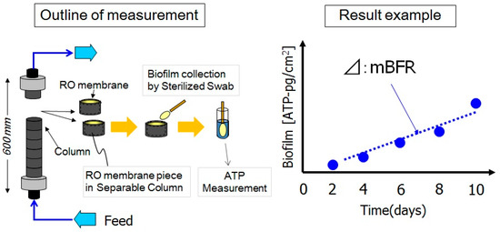To evaluate the biofouling potential of the RO fed seawater, biofilm growth monitoring devices, and seawater collection from a branching pipe just upstream of the high-pressure pump, were undertaken at each pilot unit [12]. Original biofilm growth monitoring devices were developed by Van der Kooij et al. (1995) to evaluate the biofilm formation rate (BFR), which use Glass or Teflon rings as the biofilm formation base and ultra-sonic equipment for collecting the biofilm [13,14,15]. We modified the original BFR measuring protocol as shown in Figure 6 [16]. To increase the accuracy and reliability of the biofilm formation evaluation, the biofilm formation base was changed from glass/Teflon rings to a cut piece of RO membrane. Biofilm was collected by wiping off the deposit using a sterilized swab and then suspending the deposit in 1 ml of distilled water. The flow container of mBFR was composed of consecutively-connected separable opaque plastic short columns, and a cut piece of RO membrane was installed in each short column, this produces less contaminant and damage of the biofilm carrier. Two unit columns were periodically sampled from existing columns by twisting to perform an Adenosine Triphosphate (ATP) measurement of a sample of biofilm on the reverse osmosis membrane. The portable analysis device Lumitester (registered trademark) C-100 (product of Kikkoman Corp.) and the dedicated reagent kit CheckLite 250 Plus (product of Kikkoman Corp.) were used for the ATP measurement. By dividing the ATP total amount by the wiped area, the ATP amount per unit surface of the biofilm formation base material was detected. The mBFR values were obtained from the slopes of the linear relationships between biomass and exposure time.