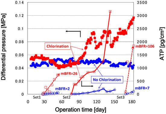 The open square and circle in Figure 7 show the variation over time of the ATP amount on the surface of a cut piece of the RO membrane in the mBFR biofilm monitor of the pilot test with and without chlorination and de-chlorination, respectively. The biofilm formation rate was very low for the non-chlorination and de-chlorination unit (open circle), suggesting that the quality of surface seawater in this area was fine during this test period. On the other hand, for the unit with continuous chlorination/de-chlorination (open square), the mBFR value was more than ten times higher than that of the non-chlorination and de-chlorination unit, and reproducible results were obtained. The combined data of the RO differential pressure and the biofilm (ATP) formation trend clearly verify not only the negative impact of continuous chlorination and de-chlorination on biofouling but also the reliability of mBFR as RO biofouling prediction and explanation indicators.