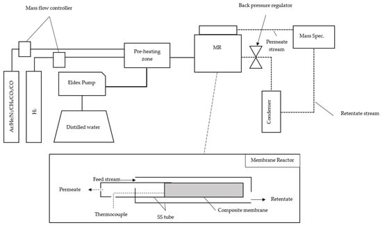 A schematic of the experimental setup is presented in Figure 1. As shown in Figure 1, the reaction gases are fed to the annular space of the MR (retentate side). The MR system was heated using an ultra-high temperature heating tape, model STH051-080. The voltage for heating was controlled by a Thermolyne-type 45,500 input control. The experimental temperature was monitored via a K-type Omega HH801A thermocouple. The accuracy of the thermocouple over a range of −100 °C to 1372 °C is ± (0.1% rdg + 1 °C). The flow rates of the feed gases were controlled using Aalborg GFC17 mass flow controllers (Aalborg Instruments & Controls Inc., Orangeburg, New York, U.S.). Deionized water was supplied to the MR using an Eldex Optos 1LMP pump. Water was vaporized, and superheated steam was formed in a spiral pre-heating zone before entering the MR. The water vapor in the retentate side was condensed using a temperature-regulated water bath (Julabo F25-EH). The pressure on the retentate side was regulated with an Ashcroft Back Pressure Regulator. The pressure on the retentate side was measured with a Swagelok EN 837-1 pressure gauge.
