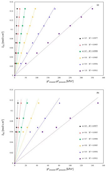 Permeating flux of H2 vs. trans-membrane pressure at 400 °C and various values of n for (a) Pd membrane (b) Pd-Au membrane.