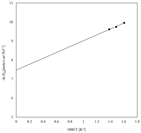 In order to evaluate values of Pe0, and Ea, permeation tests were performed for the Pd/YSZ membrane with pure H2 at a trans-membrane pressure of 100 kPa and at different temperatures ranging from 350 to 400 °C. Using Equation (5), the H2 permeance vs. reciprocal of absolute temperature was plotted on a logarithmic scale, as shown in Figure 3.