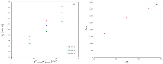 The values for Po and Ea were found to be 5.66 × 10−4 mol/m2·s·Pa0.7 and 12.8 kJ/mol, respectively. These values are comparable with the results obtained by other authors, as reported in Table 2.