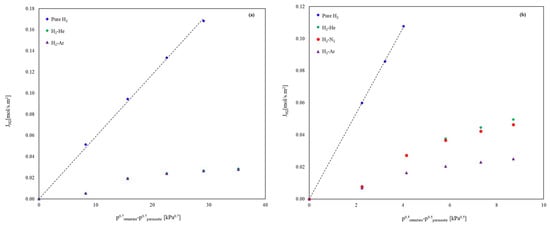 Influence of inert gases on the permeation flux of H2 in (a) Pd/YSZ and (b) Pd-Au/Al2O3 membranes.
