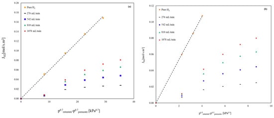 Furthermore, the influence of feed flow rate on the H2 permeation flux of the equimolar binary mixtures of H2 and Ar was investigated in this study. As shown in Figure 6, H2 permeation flux increases in each equimolar binary mixture with feed flow rate for both membranes. This can be explained by the fact that at higher flow rates, the mass-transfer resistance is reduced, and as a result, the H2 flux through the membrane is enhanced.