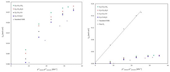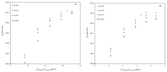 He, Ar, and N2 are assumed to be inert gases that do not adsorb on the Pd and Pd-Au surface [,,,]. Permeation tests were performed with pure H2 before and after each experiment to investigate the effects of such gases on the H2 permeating flux. Next, permeation tests with various binary mixtures using both Pd/YSZ and Pd-Au/Al2O3 membranes were performed, and H2 permeating fluxes for each gas mixture were plotted against the driving force. In the end, the permeation tests were repeated with pure H2 and the changes in permeation flux were evaluated.
