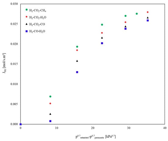 The mechanism by which the mixture of H2/CO2/CO affects the H2 flux is competitive adsorption between the CO, CO2, and H2 molecules for the active sites on the Pd surfaces, while in the ternary mixture of H2/CO2/CH4, the competitive adsorption, dilution, and concentration polarization mechanism plays an important role [,,,,].