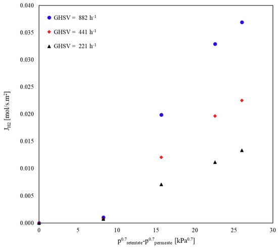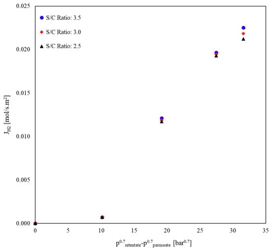 The effect of the S/C ratio was changed between 2.0 and 3.5 while keeping the GHSV constant at 441 h−1. As shown in Figure 11, the S/C ratio does not have any significant effect on the H2 permeation flux. It is worth mentioning that the industrial SMR reaction is performed at S/C ratios greater than 3/1, only to maintain the catalyst activity during the reaction []. High S/C ratios do not change the thermodynamic conditions of the SMR reaction, and only favor the kinetics of the reaction by keeping the catalyst from deactivation, which is caused by formation of fibrous carbon on the interface of the Ni catalyst []. In this study, the permeation tests have been investigated by simulating SMR streams, and no real reaction is performed. Hence, the value of the S/C ratio has no effect on the permeating flux of H2, as shown in Figure 11. However, the low S/C ratio can affect the performance of the MR during the reaction test through the deposition of coke on the catalyst active sites and membrane.