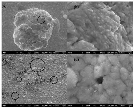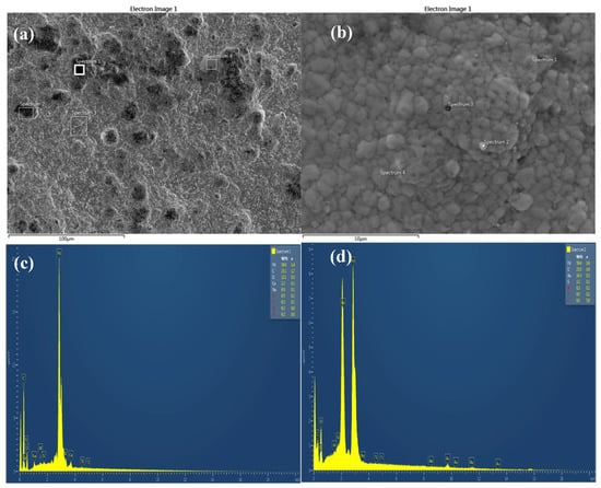 As shown in Figure 12a,b, the surface of the Pd-Au membrane is very uniform before the permeation tests, while the uniformity is distorted after the conclusion of the tests, as indicated in Figure 12c,d. Small holes can be seen on Pd-Au membrane both before and after the permeation tests. However, the number of these pinholes is much lower, and their sizes are smaller in a pristine Pd-Au membrane compared with the Pd-Au membrane that has undergone permeation tests. Fernandez et al. [] reported that the existence of impurities during the membrane fabrication process could lead to the development of pinholes. The existence of small pinholes in the pristine membrane confirms the fact that some impurities could exist during the electroless plating process. Suleiman et al. [] reported that continuous exposure of the Pd surface to H2 causes lattice dilation which, in turn, leads to the development of pinholes and cracks on the membrane surface. Baloyi et al. [], reported that exposure of the membrane to H2 and the diffusion of H2 atoms through the bulk of metal results in the expansion of lattice structure. They attributed the development of pinholes after the permeation tests to the phase change from a to b-phase and the formation of Pd-hydride.