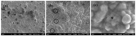 For the Pd/YSZ membrane, the SEM-EDS analysis was performed on the membrane only after the reaction tests. One can see the development of a number of pinholes on the Pd surface in Figure 13. The diameter of these pinholes is approximately 200–300 nm, as can be seen in Figure 13c. According to Guazzone and Ma [], incoherent sintering of small Pd clusters or Pd crystallites could result in the formation of pinholes at temperatures between 400–450 °C. Another possible explanation for the development of pinholes could be the numerous cycles of cooling and heating that the membrane has gone through during the tests, as well as the adverse effects of the gaseous components such as CO on the membrane surface. The fact that the ideal selectivity values of H2/He and H2/Ar were not infinite at the beginning of the permeation tests and constantly reduced as the permeation tests continued confirms that the development of pinholes is a combination of incoherent sintering during electroless plating, numerous cycles of heating and cooling, and/or due to the bursting of gas pockets close to the membrane surface in the FCC Pd membrane [].