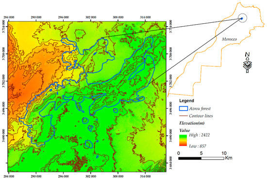 Among other forests in Morocco, the Azrou forest has been gaining popularity as a tourist attraction, due to its rich biodiversity and ecosystem values. It is dominated by the Atlas cedar (Cedrus atlantica) known as a noble tree species [], representing an important resource that underpins the progress of socioeconomic development and benefits to the local population and the country, in general. However, the study area is subjected to several environmental disequilibria, including soil erosion, overgrazing, cutting of trees, etc. Along with these, the cedar forest is altered and affected by an advanced stage of degradation, according to []. For these reasons, the Azrou forest was selected for this research to create up-to-date LULC maps, which could be used as scientific data for efficient decision-making in the forest ecosystem.