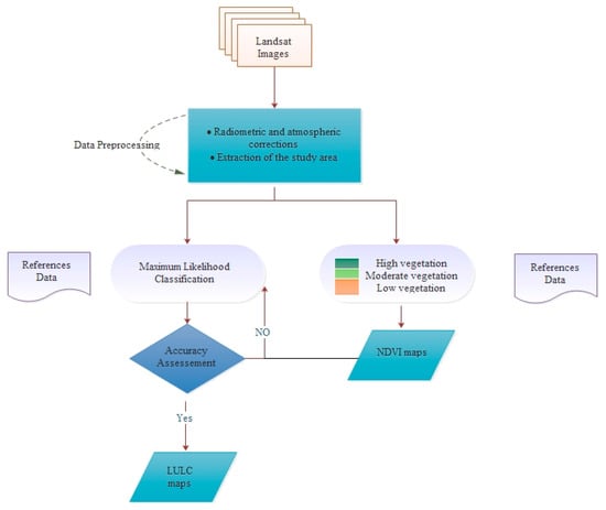 Keeping all the above reasons in view, we have integrated remote sensing data, Geographic Information System (GIS) analysis, and field surveys, in order to evaluate the potential of Landsat imagery to monitor spatiotemporal changes in land cover in the Azrou forest. Thus, to obtain the different land use classes, the NDVI was used to identify and to improve discrimination between LULC categories throughout the study area. Then, the maximum likelihood classification (MLC) supervised classification method was applied in this study because of its availability, and it does not require an extended training process [,].
