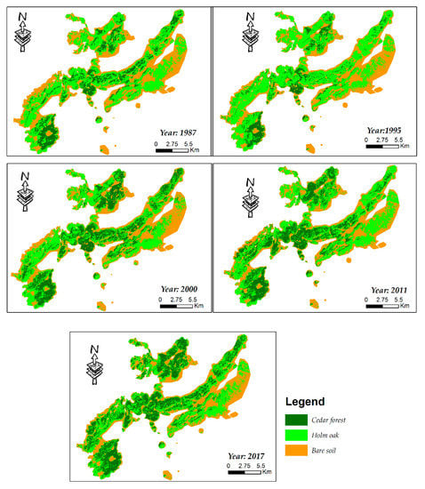 LULC changes were estimated from 1987 to 2017 (Table 4). Holm oak was the dominant land class in 2017, with 37.1% of the occupancy. Cedar forest class changed slightly from 1987 to 2017. Bare soil decreased from 45.5% to 32.4% (Table 4). Classified maps, showing the LULC categories in Azrou forest, are shown in Figure 3.