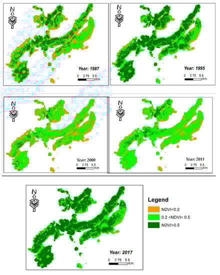 Based on the values of NDVI and in the interpretation of Google Earth images to identify and to quantify the vegetation change during the analysis period (1987–2017), we applied an NDVI thresholding [,] to classify NDVI into three classes: (1) NDVI values below to 0.2 were considered as low-density vegetation (2) NDVI values between 0.2 and 0.5 were considered as moderate-density vegetation and (3) NDVI values higher than 0.5 were considered as high-density vegetation. This classification depends on the soil type and, in this case, is based on the knowledge of the study area characteristics.