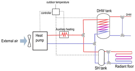 Notice that a temperature-controlled mixing valve is installed, both on the DHW and the SH supply system. This secondary control, connected to a three-way valve, mixes the water exiting from the tanks with cold water in order to meet the supply water temperature (i.e., 45 °C for DHW and depending on the outdoor reset control for the SH).