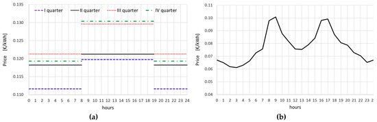 The electricity market is set up to match energy supply and demand in Italy. For this reason, there is trading between generators and suppliers in the Italian Power Exchange. The increasingly widespread diffuse electricity production and the growing number of heat pump installations are altering the grid balance and in order to face those changes, the electricity marked is evolving. Italian energy providers have recently introduced a time-of-use tariff for the domestic users that does not penalize consumers with large annual electricity needs. This rate will promote the adoption of AWHPs for space heating or cooling. The time-of-use tariff has two electricity prices that change every three months (Figure 2a). During the weekdays, the F1 price is used from 8:00 AM to 7:00 PM, while the F23 price is available from 7:00 PM to 8:00 AM. The F23 is also applied for the weekends. The annual electricity bill also includes fixed costs (about 159 €/y for a committed power of 4.5 kW) and 13% of fees (in 2017) [30]. The daily profiles of the time-of-use tariff, including transport/management and system charges, are shown in details in Figure 2a. Figure 2b represents instead a typical profile of the real price on the market (unique national price; PUN) that reflects the unbalance of electricity exchanges between the grid and the consumers/producers.