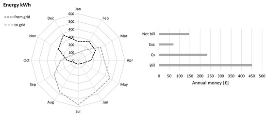 In the reference case, the annual is 7%, and the remaining energy from the PV system is delivered to the grid. Such a low value is due to the configuration of the model, where no cooling applications or domestic appliances are taken into account, as explained in the introduction. Only the DHW needs are covered in the summer months, and consequently, a large amount of surplus energy is produced. Figure 3 includes some significant results about the simulation of the reference case. On the left, the monthly energy exchanged with the grid is represented, and it is evident that the energy to the grid exceeds the energy from the grid, especially in summer. On the right, annual costs/incomes for the householder on the base of the net-metering scheme indicate that the contribution considerably reduces the .