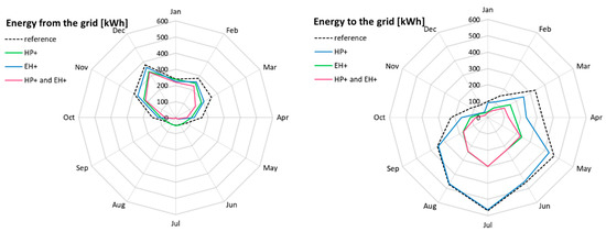 Figure 4 compares the three simulations with the new control strategies to each other and to the reference case, in terms of monthly energy fluxes. All of the algorithms applied have the effect of reducing the exchanges with the grid (energy drawn from the grid and energy delivered to the grid). In other words, the algorithms improve the self-consumption and the self-sufficiency, especially when the HP+ and EH+ are combined together. In this case, the increases from 7% to 60%, and the from 12% to 65%. This result therefore highlights the potential benefit for the grid manager if this algorithm were extensively applied in buildings with PV systems.