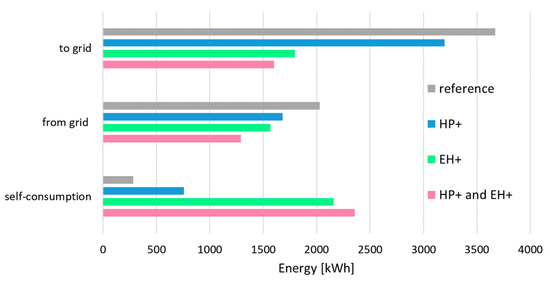 The reduction of the energy exchanges is also evident from Figure 5, in which the increase of self-consumption is also shown on the annual balance. This increase is quantified as 167% for HP+, 660% for EH+, and 729% for HP+ and EH+, with respect to the reference case. Note that the self-consumption exceeds the energy drawn from the grid when the EH+ or the HP+ combined with EH+ algorithms are adopted.