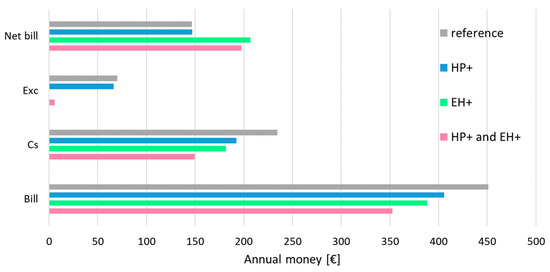Figure 8 shows the different effects of the contribution to the from an economic point of view. In both the case with HP+ only and with HP+ and EH+, the term is equal to zero, and the term is lower for the smaller area size; the resulting penalizes this situation. Therefore, an oversized system is more profitable, compared to one that is more suitable to the actual energy needs of the building by considering the running costs. Nonetheless, the different installation costs and the payback times should also be considered.