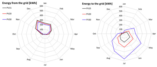Finally, Figure 7 and Figure 8 show the influence of the PV array area (or aperture) on the energy exchanges and costs. Figure 7 clearly shows how, passing from 15 m2 to 30 m2, the energy withdrawn from the grid obviously decreases, and the energy fed into the grid increases. With a PV area of 15 m2, the energy withdrawn exceeds the energy delivered to the grid. The increases from 65% (PV15) to 58% (PV20) and 72% (PV30) by oversizing the area, while the increases from 60% (PV15) to 65% (PV20), but then decreases to 48% (PV30).