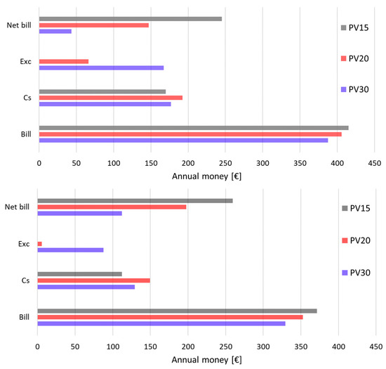 Annual bills/takings for the householder on the base of the net-metering scheme (Equations (1)–(3)) for the case with control strategy HP+ only (above) and HP+ EH+ (below), as well as for a PV area of 15, 20, and 30 m2.
