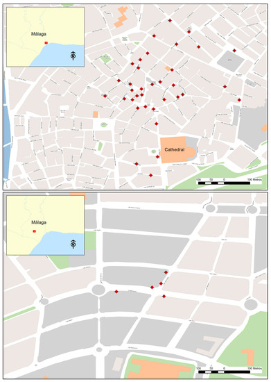 The city center is the oldest part of the city. It has an area of 3.17 km2 with a predominance of foot traffic and narrow streets and more than 1000 restaurants, bars, pubs, and terraces [37,38]. This area has experienced a great increase in tourism and recreational activity in recent years. Since the 1960s, the population in this area has been gradually decreasing. To curb depopulation, the Special Plan for the Protection and Interior Reform of the Historic Quarter (PEPRI) was implemented during the 1990s [39]. This plan consisted of improving security problems and mitigating the abandonment of the city center by remodeling historic buildings, increasing the number of green areas, encouraging the rehabilitation of private housing, and stimulating the creation of local businesses to provide services to residents [40]. These measures succeeded in slowing down the city center exodus, but with the arrival of the world economic crisis in 2008, many local businesses were transformed into restaurants and leisure facilities [37], trying to take advantage of the rapid growth of the city as one of the main tourism hubs in southern Spain [35,36]. Tourist destinations and leisure activities have attracted large numbers of both tourists and native citizens from the entire Málaga area; therefore, this is a busy area during the day. Nighttime activity has been focused in some specific locations, especially during the weekends. In the streets analyzed in this study, there are approximately 1600 residents, according to city council statistics.