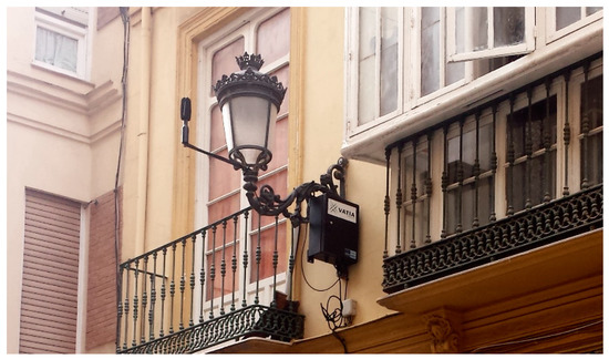 The measurements were adjusted according to the methods specified in ISO 1996-2 [45]; therefore, all the results can be considered to be descriptive of the incident sound, which is the reference condition in ISO 1996-2. For practical reasons, the microphones had to be situated at different heights between 4 and 8 m (to be considered for future analysis). As an example, Figure 2 shows the installation of one of the monitors.