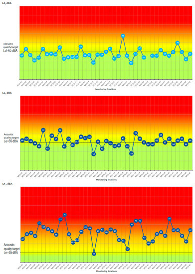 Additionally, we presented the results as a map, as shown in Figure 4, where the color labels are linked to the sound levels: Green means below the target and red means 10 dBA above the target. This type of presentation is similar to those used in many other noise-monitoring platforms [48,49,50].