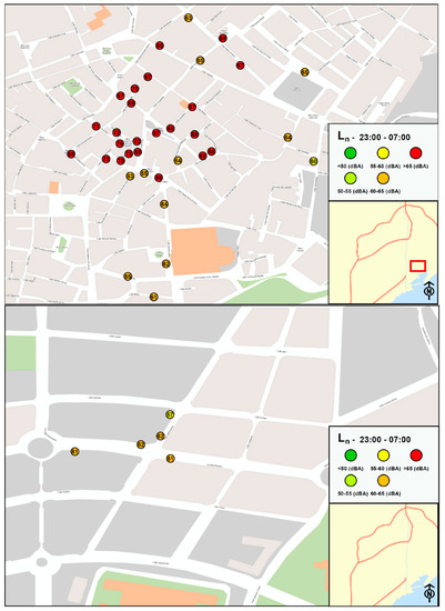 Map of long-term noise assessment during the nighttime period for the city center locations (top map) and Teatinos (bottom map).