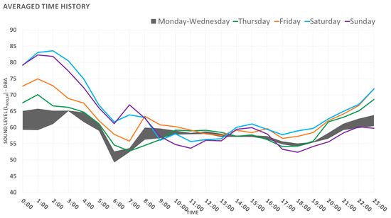 In general, the noise levels started to increase in the late hours on Thursdays and remained high during weekend evenings and nights. The maximum noise levels were observed during the evening and nighttime periods on Saturdays. The noise level (LAeq,1h) was quite high throughout the night in most of the locations. The noise level exceeded 70 dBA for several hours on weekend nights at 83% of the locations, 75 dBA at 15%, and 80 dBA at 10%. During weekdays, 88% of the locations had a quiet period (below 55 dBA) for 2–5 h, but this period decreased to 1–3 h during the weekends or even disappeared in 75% of the locations. An example of this hourly noise-level evolution can be seen in Figure 6 for one of the units in the city center, but all of them followed the same pattern with a time displacement of between 1 and 3 h.