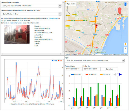 Figure 7. Real-time web access graphical interface. The system was optimized for friendly access from PC, tablet, and smartphone devices, with the goal of reaching the widest possible audience. - Noise indicators. The noise indicators for the daytime (Ld), evening (Le), and nighttime (Ln) periods appeared in reports generated in response to users’ queries and could be compared to regulation noise levels.