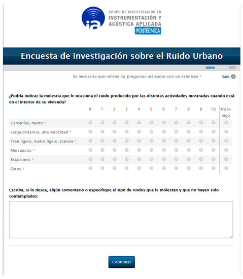 Additionally, as mentioned above, we decided to use surveys, since it is the modality that best suits our need to measure the citizens’ engagement, as well as their noise perception. Although this research focuses on leisure noise, we decided to extend the scope of the survey to gain participation from citizens concerned about other noise sources, such as aircraft and road traffic. This is the same reason that led us to make the survey open not only to residents of the studied areas, but also to the whole city and the whole country.
