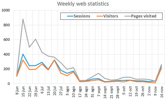 Despite the efforts expended on improving the visibility of this initiative, the objective to engage citizens was clearly not met. The number of visits to the website—a mere 5410—was not particularly high during the project, and we observed that this low impact became even more limited after two months, as seen in Figure 9. The bounce rate (people leaving the site quickly) was also very high (80%), which suggests that the web design was not sufficiently attractive or that the visitors were more curious than truly interested in the topic. We found no correlation between any of these statistics and noise levels, which confirms that the initiative did not reach the target demographic (residents exposed to leisure noise in Málaga).