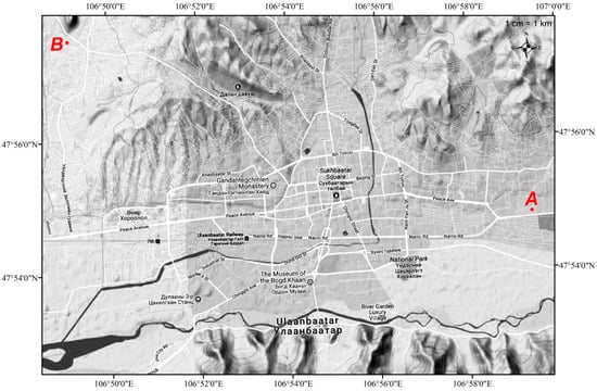 Location of the Amgalan (A) and Bayankhoshuu (B) official monitoring stations in Ulaanbaatar, Mongolia.