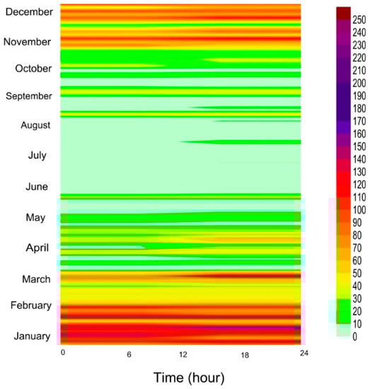 The illustration of the Amgalan official station on the Ulaanbaatar map was performed using the ArcGIS 10.5 software (Esri, Redlands CA, USA). Some raw data were missing due to apparatus malfunction and severe meteorological conditions, where the minus forty regularly occurred during winter. The data interpolation was performed using the IBM SPSS 20 software (IBM corporate, Armonk NY, USA). Missing data patterns were checked by multiple imputation commands in the program. According to the missing data pattern, 6.35% of the monotone and arbitrary data was missing. To treat the missing values, linear regression was automatically applied using multiple imputation commands in IBM SPSS 20. By reducing the amount of missing values for ambient air pollutants, multiple interpolation were performed using chained equations [22]. In order to exemplify or illustrate hourly variation in SO2 throughout the year, the Surfer 13 software (Golden Software LLC, Golden CO, USA) was used. The yearly trend in SO2 concentration is shown in Figure 2. This method was chosen because it rapidly and clearly illustrates patterns of SO2 concentration.