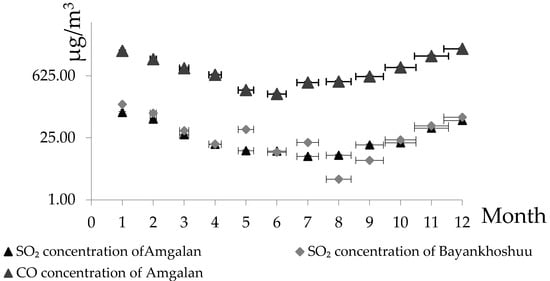 We observed that the SO2 concentration at the Amgalan official station was less than that at the other official station, Bayankhoshuu. The same trend in monthly SO2 variation was recorded at the Amgalan and Bayankhoshuu official stations, as shown in Figure 3. The SO2 concentration at both stations had a U-shaped trend, reaching the highest concentration in January and the lowest concentration in July. The most striking observation was that the SO2 concentration at Bayankhsohuu was 50 µg/m3 higher than at Amgalan in January whereas the SO2 concentration at Amgalan was three times lower than at Bayankhoshuu in August.