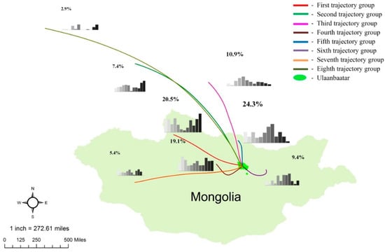 The results showed that 21.2% of total back-trajectories were sourced from foreign territories, whereas 78.8% of total back-trajectories were created inside Mongolia. As shown in Figure 5, the 8760 trajectories were divided into eight groups: The first trajectory group (20.5%), second trajectory group (7.4%), third trajectory group (10.9%), fourth trajectory group (19.1%), fifth trajectory group (24.3%), sixth trajectory group (9.4%), seventh trajectory group (5.4%), and eighth trajectory group (2.9%).